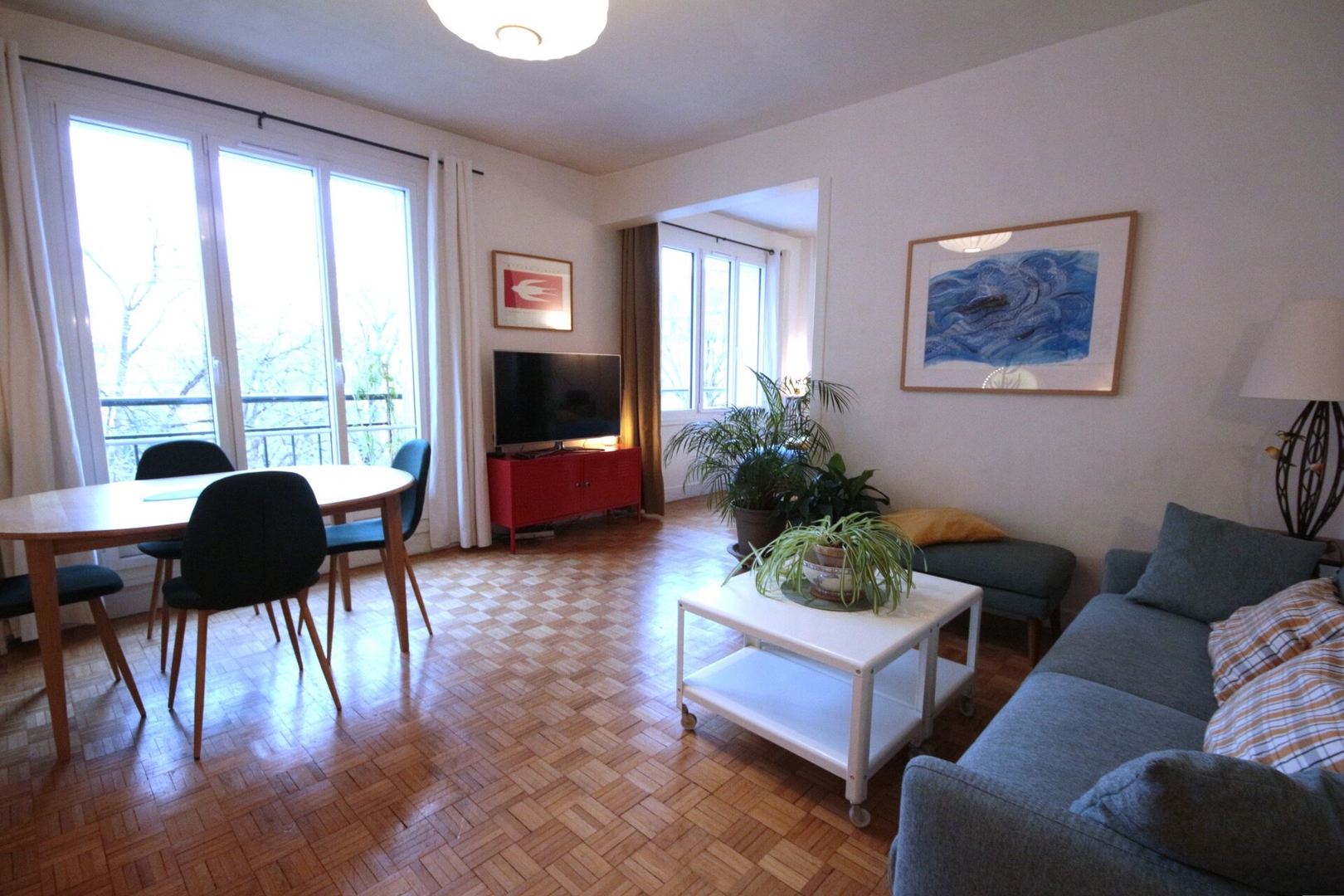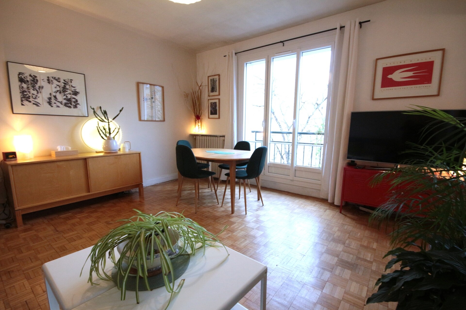 Situé au 4e étage avec ascenseur, entrez dans un espace de vie chaleureux et accueillant qui combine la salle à manger et le salon, créant une atmosphère confortable pour des moments partagés et de la détente. Cet espace dispose d'une table confortable pour quatre personnes et d'un canapé-lit confortable qui se transforme facilement en lit pour des invités supplémentaires. Profitez de ce cadre intime, idéal pour se détendre avec un bon livre ou siroter un verre de vin après une journée d'exploration.