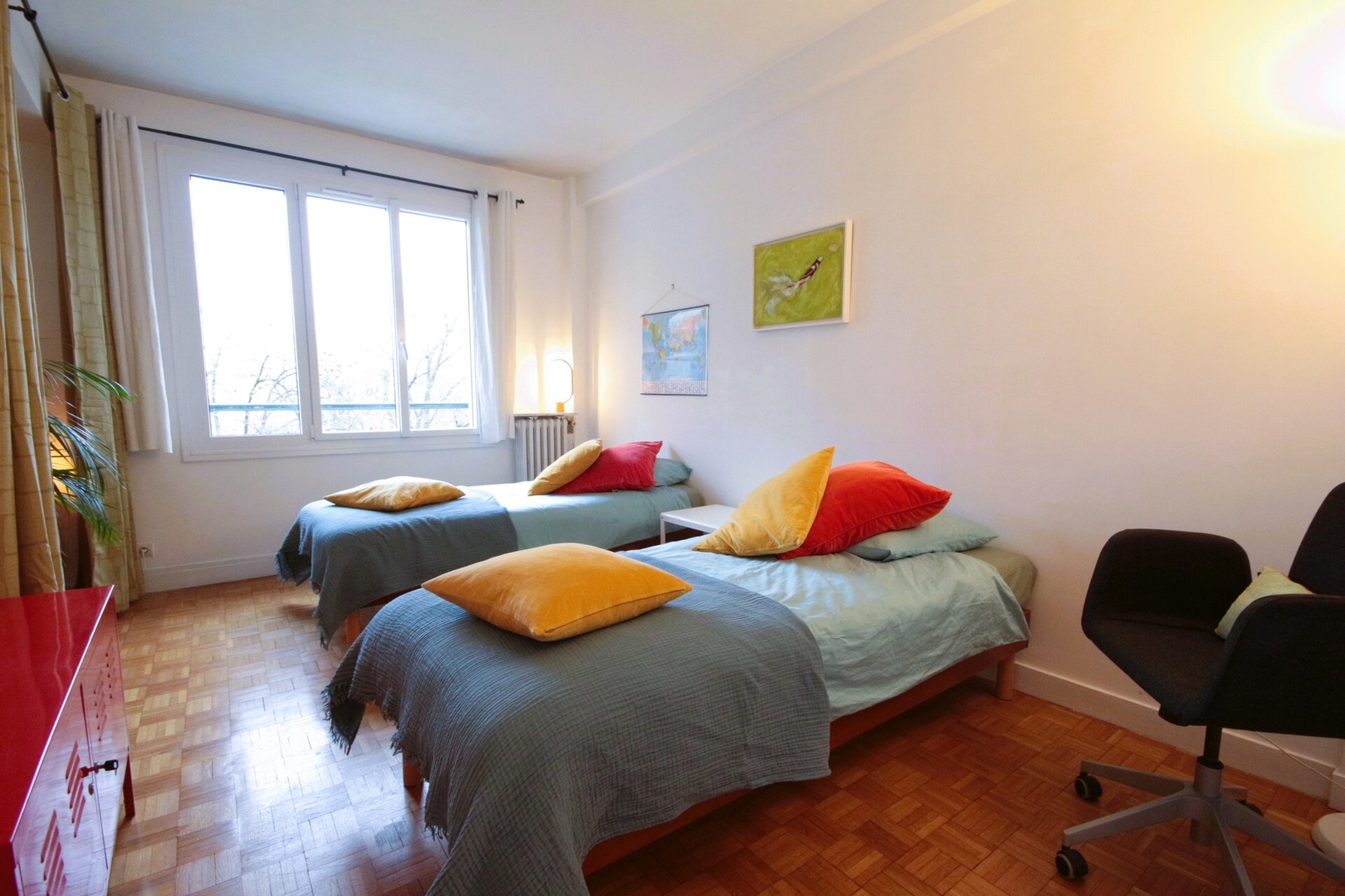 La zone de la chambre ouverte est un espace tranquille avec deux lits simples confortables, des draps doux et une touche de charme parisien. Profitez d'une nuit de sommeil paisible dans cette retraite confortable.